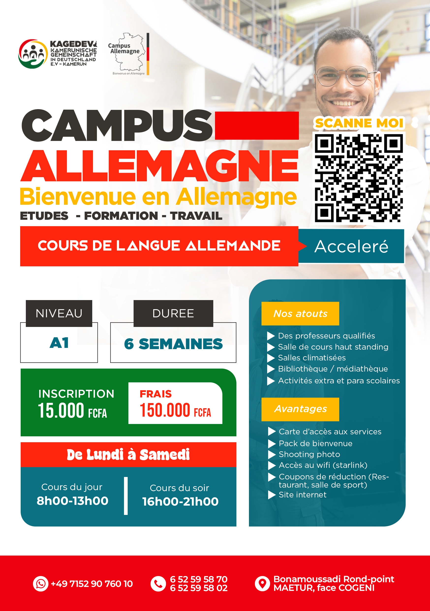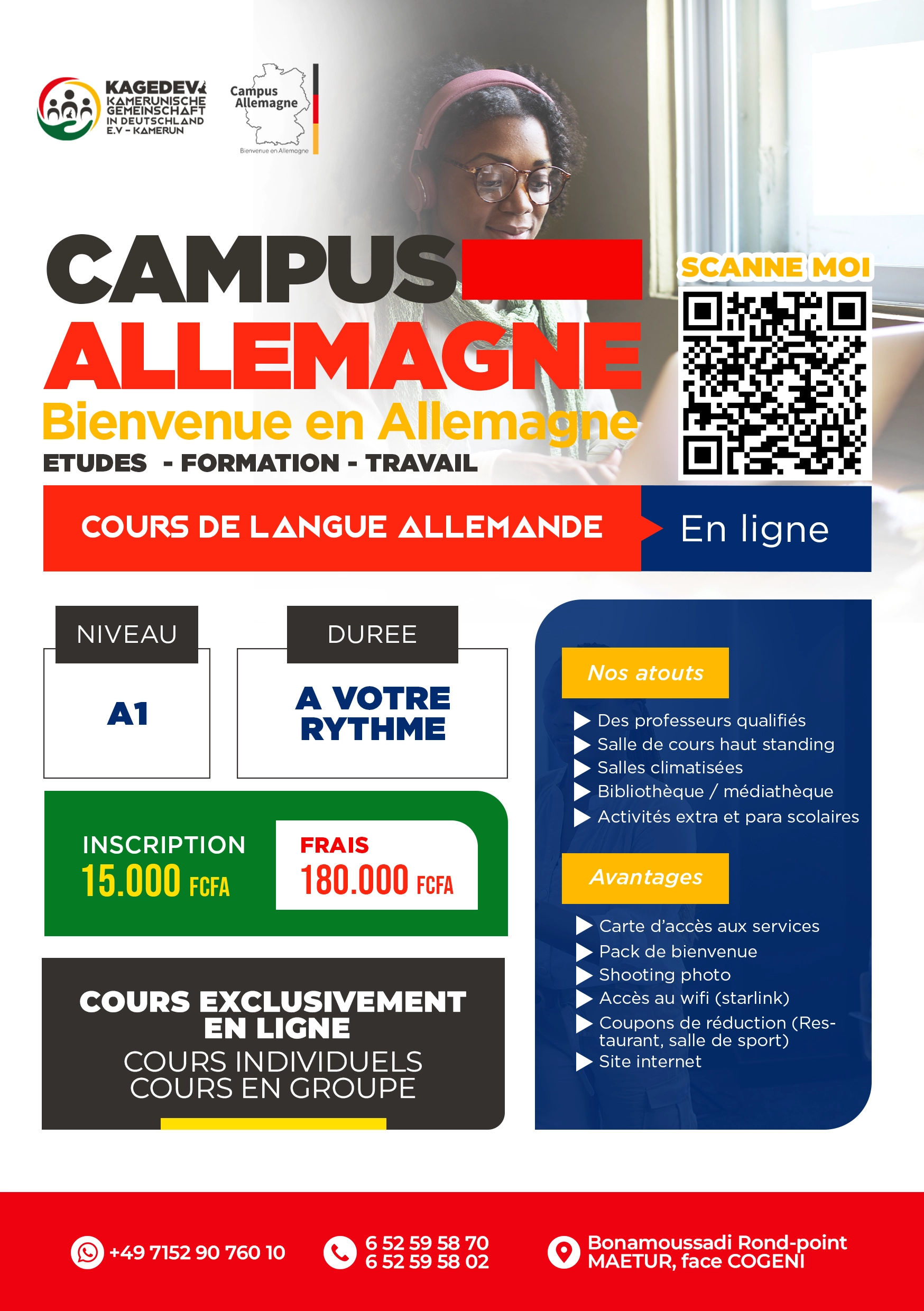 Boutique Kagedev expose des produits et services qu’il propose à tous dans plusieurs secteurs de vente. Nous proposons actuellement des cours d’allemand disponibles en ligne ou en présentiel au Campus Allemagne dès le 03 novembre 2025, au rond-point Maetur Bonamoussadi immeuble nice cream (face COGENI). Vous pouvez payer votre place en ligne ou sur place selon votre aise. Nos programmes sont conçus pour s’adapter à chacun pour un apprentissage optimal de la langue que vous souhaitez dans nos classes ou depuis chez vous. Si vous avez des questions contacter nous directement via WhatsApp